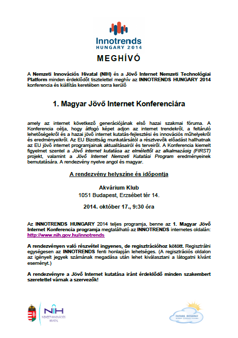A Jövő Internet Nemzeti Technológiai Platform (FI NTP) és a Nemzeti Innovációs Hivatal (NIH) közösen rendezik meg a Magyar Jövő Internet Konferenciát (MJIK 2014) az INNOTRENDS 2014 rendezvénysorozat keretében. Az INNOTRENDS a hazai innováció seregszemléje, amelyet az NIH 2014. október 16-17-én Budapesten szervez. A Magyar Jövő Internet Konferenciára 2014. október 17-én kerül sor az Akvárium Klub nagytermében (Budapest V. Erzsébet tér 14.). A rendezvényen való részvétel ingyenes, de regisztrációhoz kötött. A rendezvényre az INNOTRENDS konferencia honlapján lehet jelentkezni.