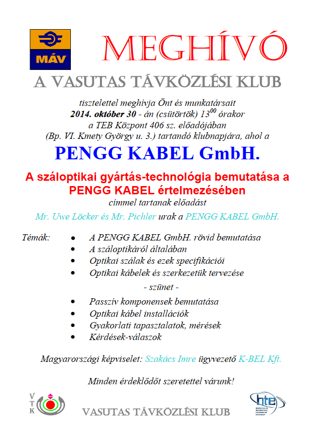 A VASUTAS TÁVKÖZLÉSI KLUB tisztelettel meghívja Önt és munkatársait 2014. október 30 - án (csütörtök) 13.00 órakor a TEB Központ 406 sz. előadójában (Bp. VI. Kmety György u. 3.) tartandó klubnapjára, ahol a Pengg Kabel GmbH.