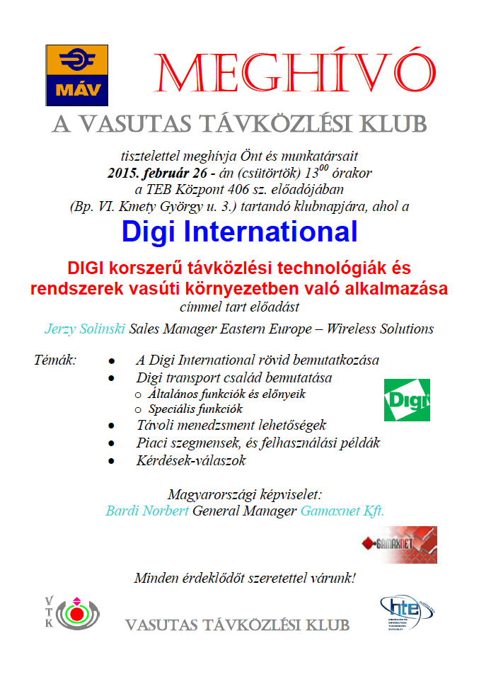 A VASUTAS TÁVKÖZLÉSI KLUB tisztelettel meghívja Önt és munkatársait következő klubnapjára, ahol a