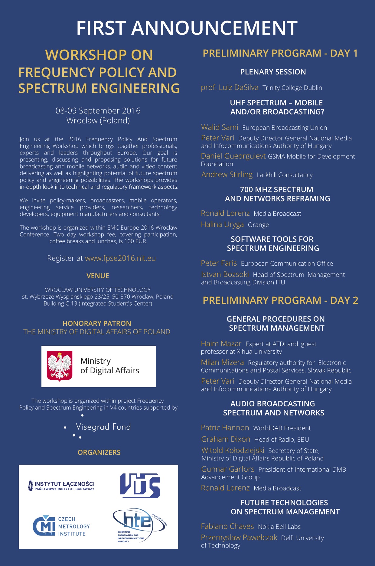 The workshop is organized within project Frequency Policy and Spectrum Engineering in V4 countries supported by Visegrad Fund.