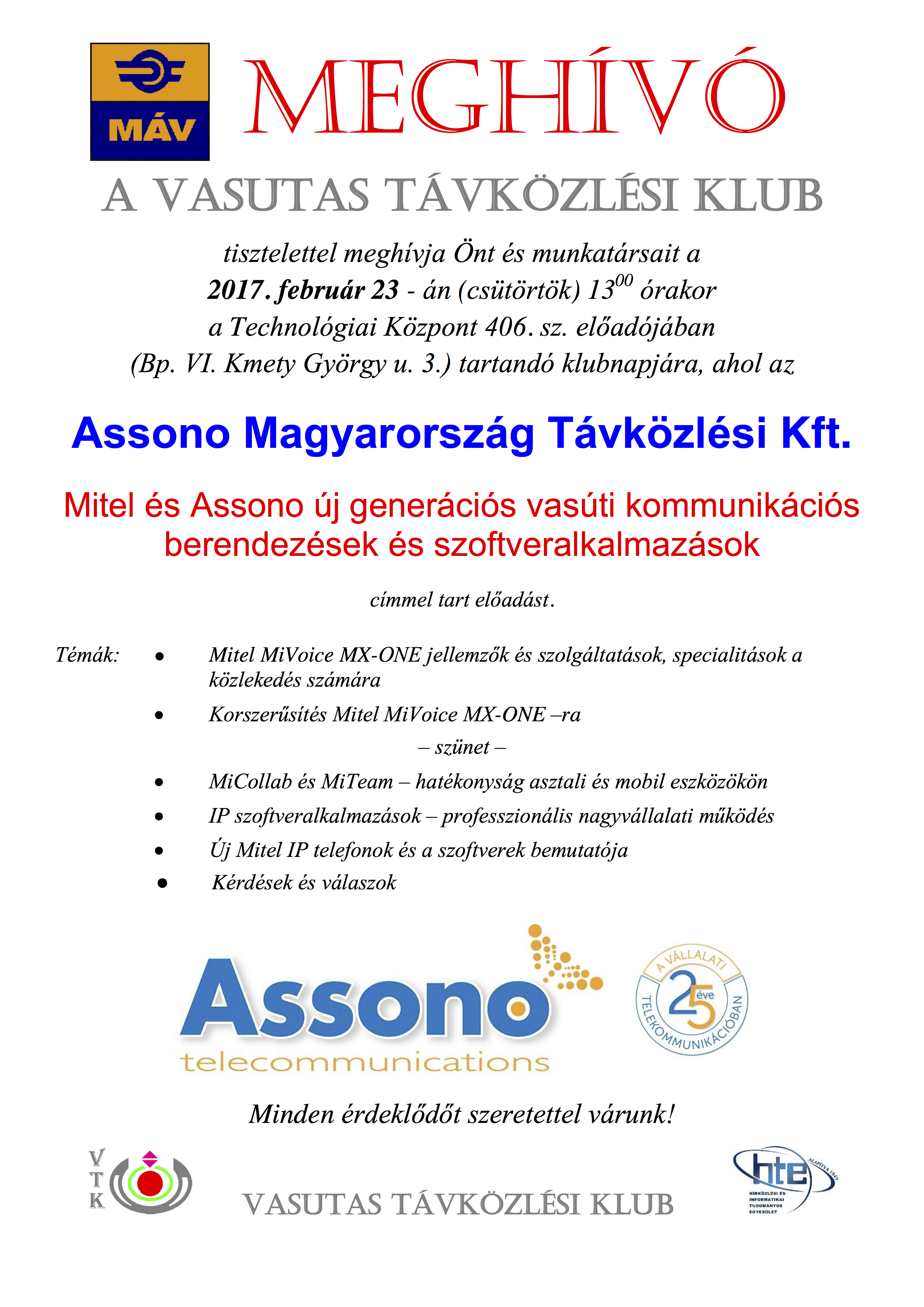 A VASUTAS TÁVKÖZLÉSI KLUB tisztelettel meghívja Önt és munkatársait következő klubnapjára, ahol az Assono Magyarország Távközlési Kft.