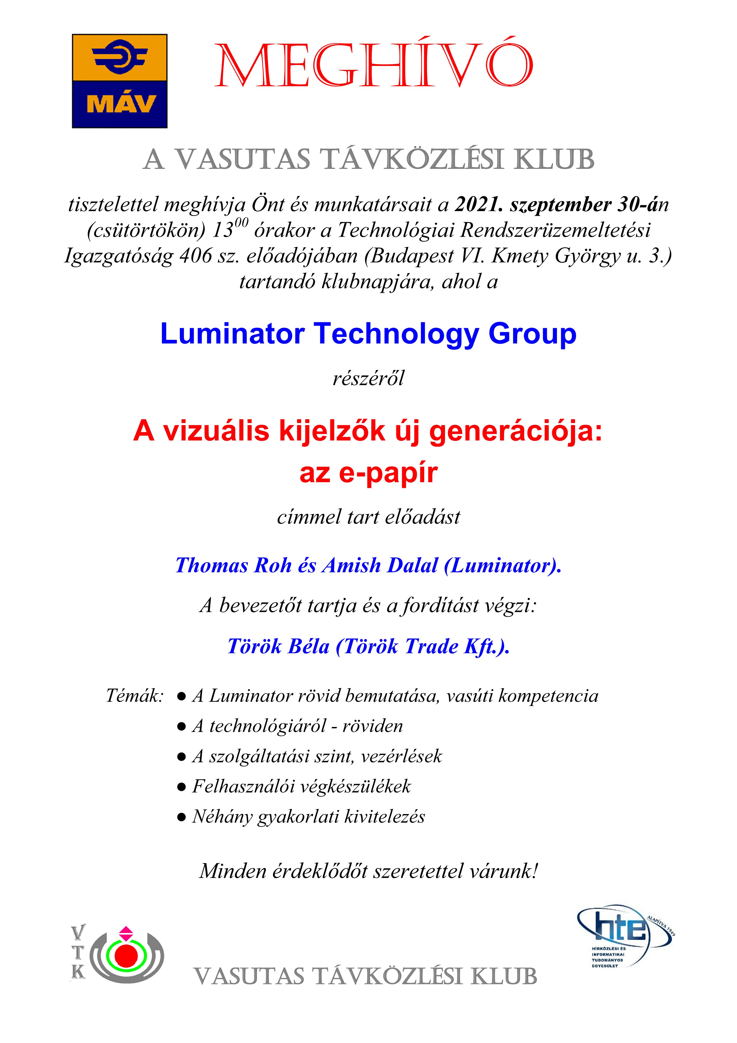A VASUTAS TÁVKÖZLÉSI KLUB tisztelettel meghívja Önt és munkatársait a Technológiai Rendszerüzemeltetési Igazgatóság 406 sz. előadójában tartandó klubnapjára, ahol a Luminator Technology Group tart előadást: