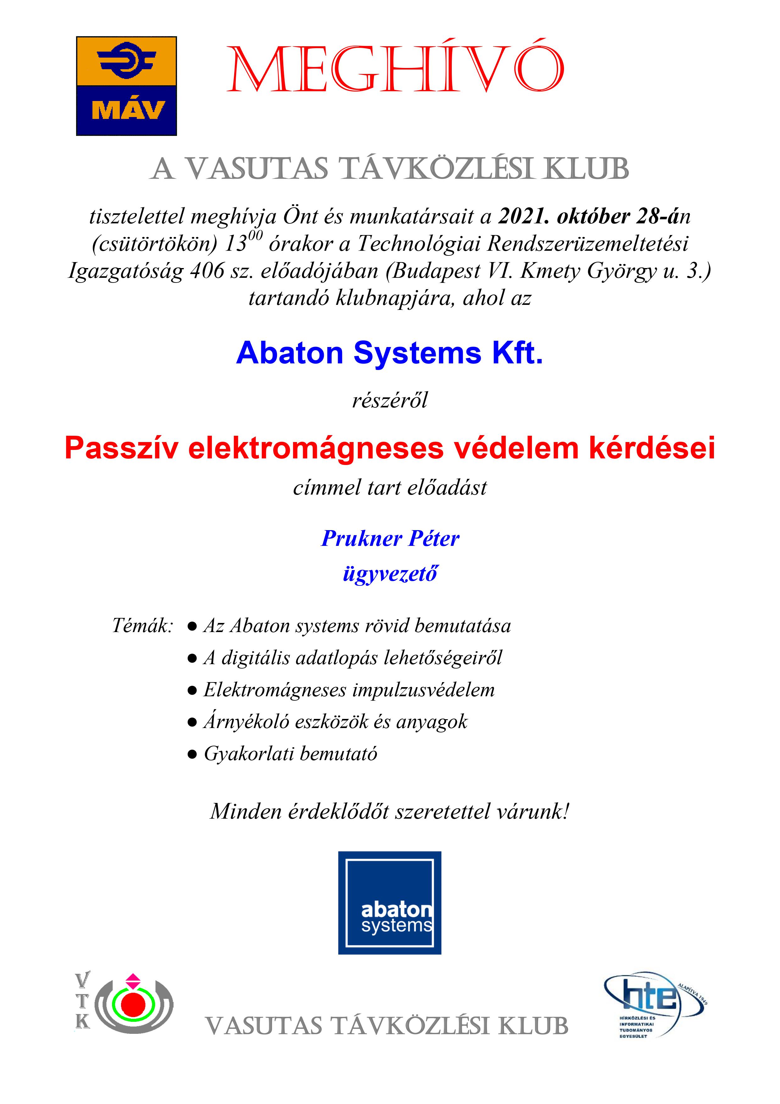A VASUTAS TÁVKÖZLÉSI KLUB tisztelettel meghívja Önt és munkatársait a Technológiai Rendszerüzemeltetési Igazgatóság 406 sz. előadójában tartandó klubnapjára, ahol az Abaton Systems Kft. tart előadást: