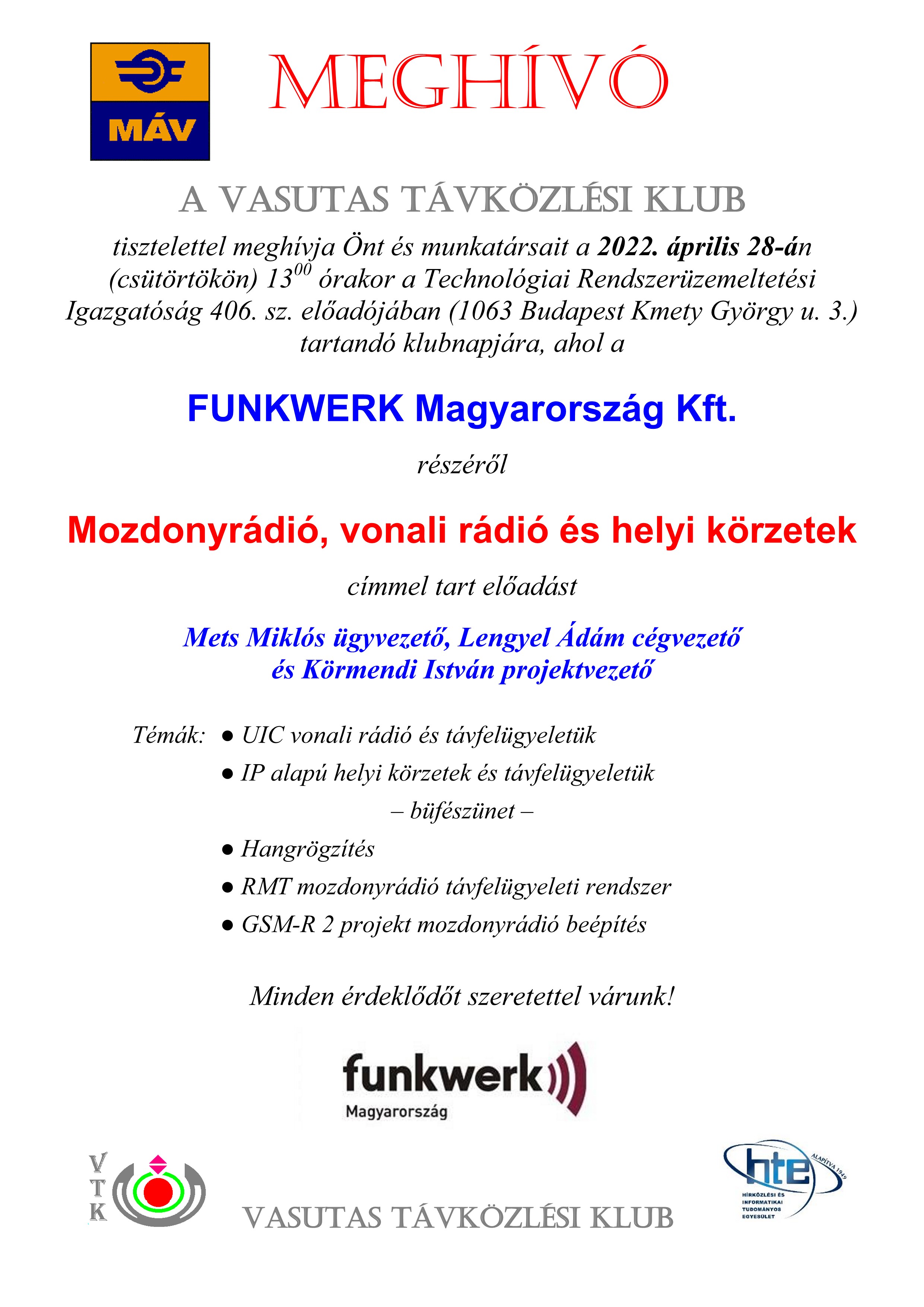 A VASUTAS TÁVKÖZLÉSI KLUB tisztelettel meghívja Önt és munkatársait klubnapjára, ahol a FUNKWERK Magyarország Kft. tart előadást: