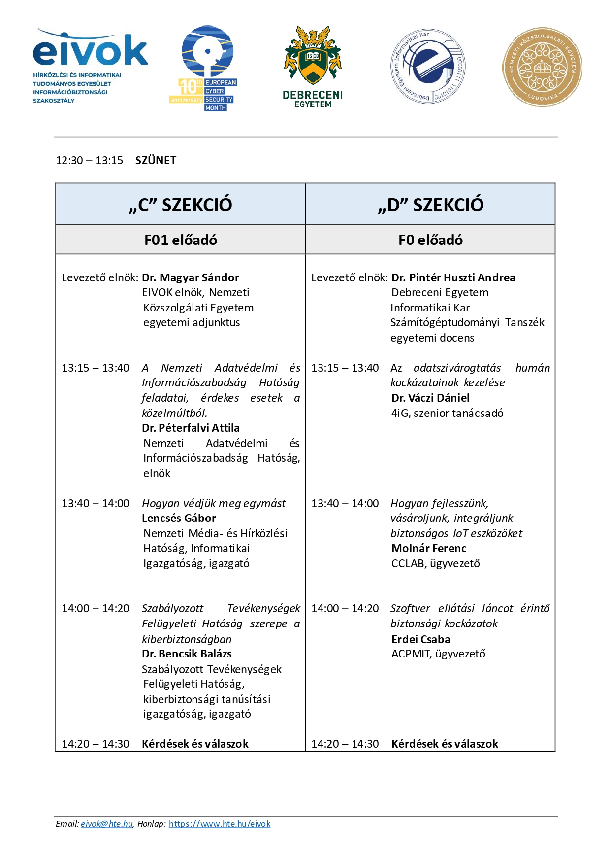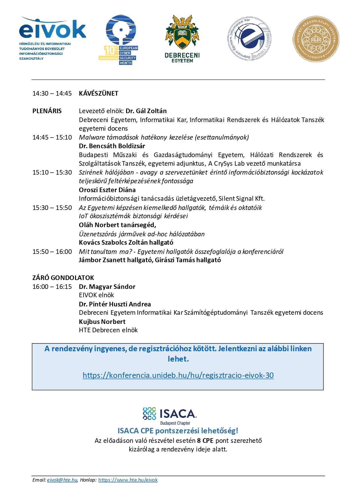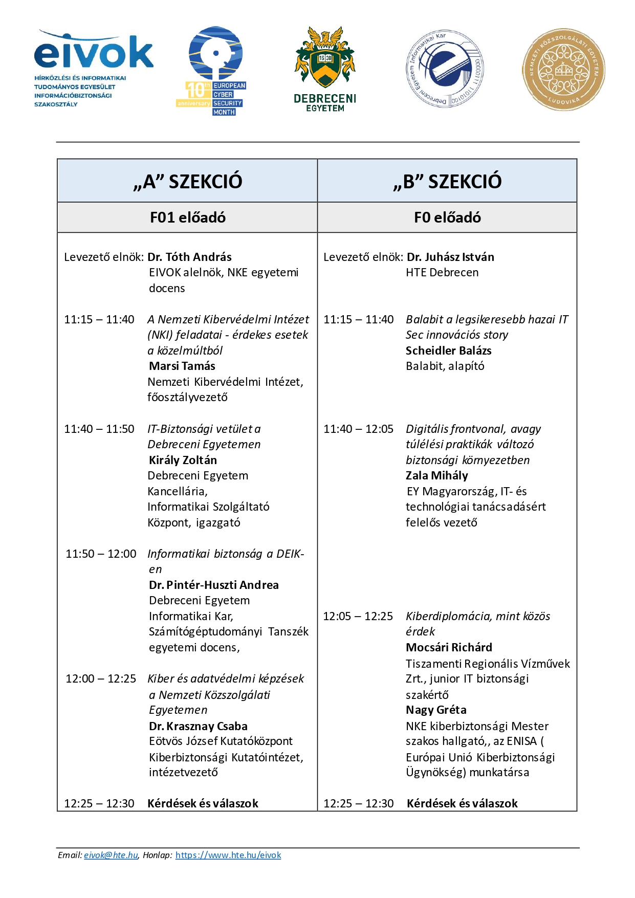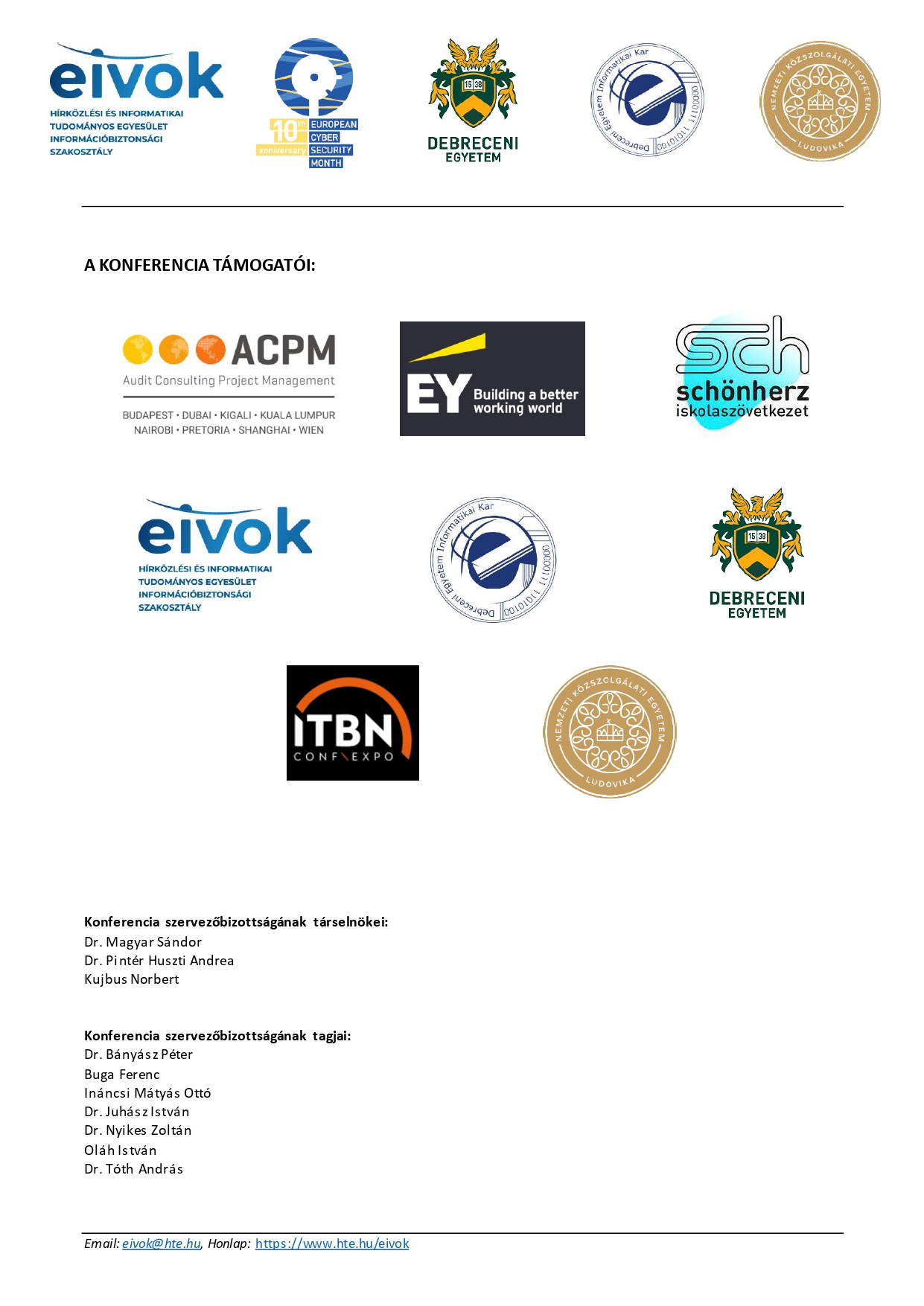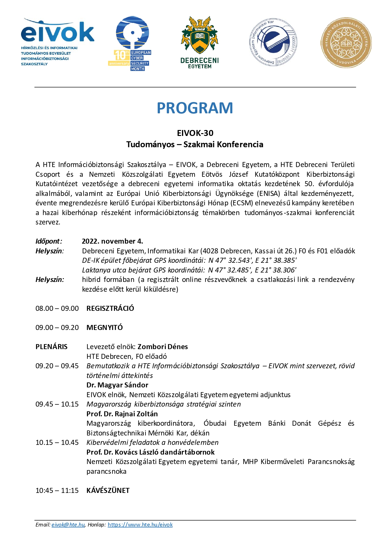 A HTE Információbiztonsági Szakosztálya – EIVOK, a Debreceni Egyetem, a HTE Debreceni Területi Csoport és a Nemzeti Közszolgálati Egyetem Eötvös József Kutatóközpont Kiberbiztonsági Kutatóintézet vezetősége a debreceni egyetemi informatika oktatás kezdetének 50. évfordulója alkalmából, valamint az Európai Unió Kiberbiztonsági Ügynöksége (ENISA) által kezdeményezett, évente megrendezésre kerülő Európai Kiberbiztonsági Hónap (ECSM) elnevezésű kampány keretében a hazai kiberhónap részeként információbiztonság témakörben tudományos-szakmai konferenciát szervez.