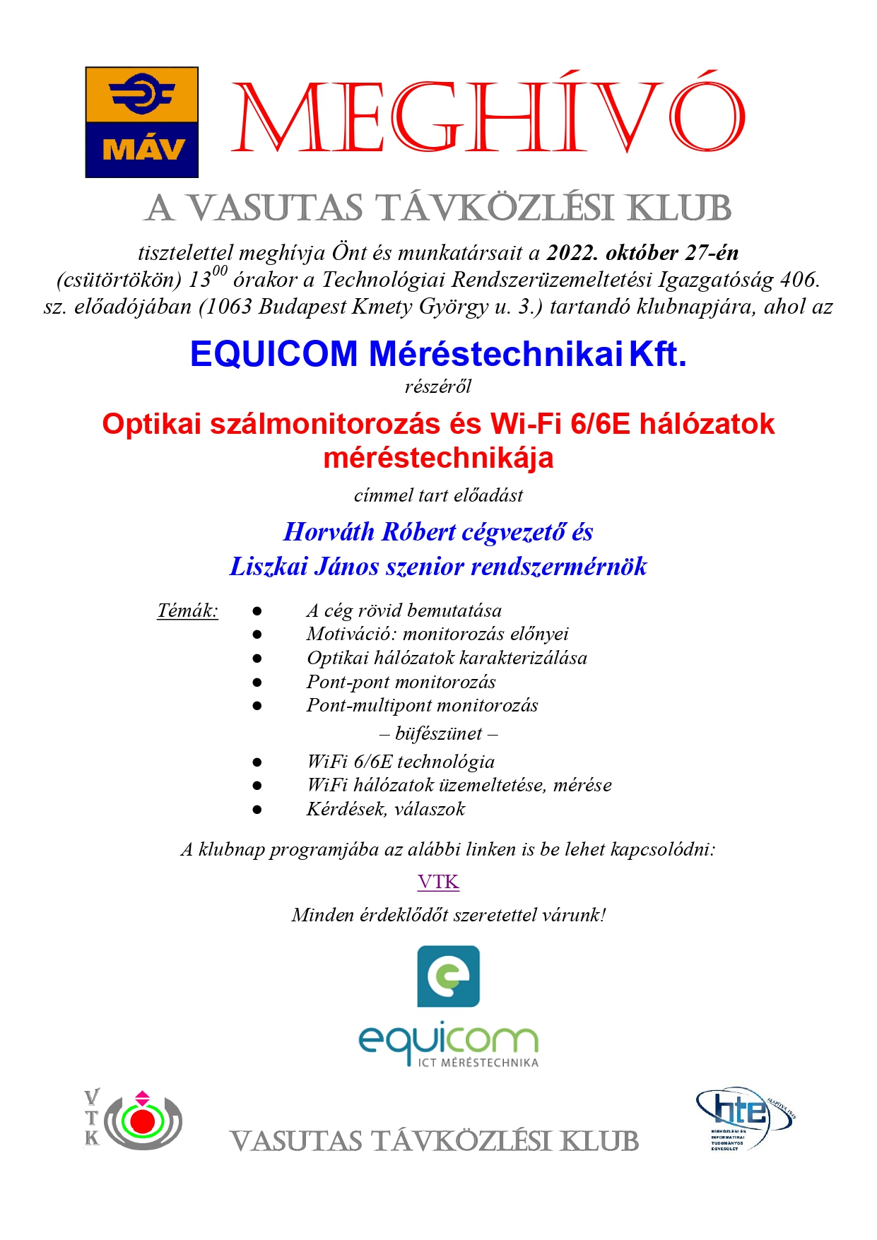 VASUTAS TÁVKÖZLÉSI KLUB tisztelettel meghívja Önt és munkatársait klubnapjára, ahol a EQUICOM Méréstechnikai Kft. tart előadást: