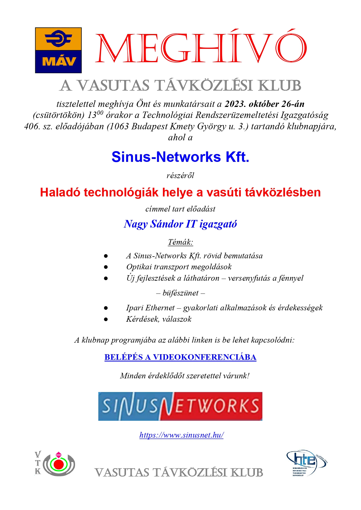 A VASTUTAS TÁVKÖZLÉSI KLUB tisztelettel meghívja Önt és munkatársait a 2023. október 26-án (csütörtökön) 13:00 órakor a Technológiai Rendszerüzemeltetési Igazgatóság 406. sz. előadójában (1063 Budapest Kmety György u. 3.) tartandó klubnapjára, ahol a