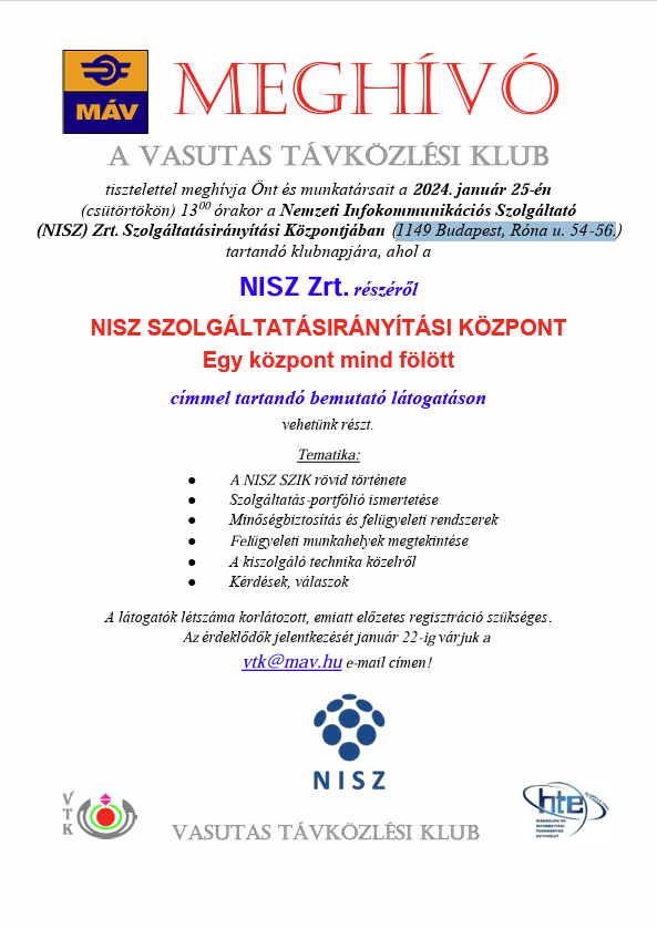 A VASUTAS TÁVKÖZLÉSI KLUB tisztelettel meghívja Önt és munkatársait a 2024. január 25-én (csütörtökön) 1300 órakor a Nemzeti Infokommunikációs Szolgáltató (NISZ) Zrt. Szolgáltatásirányítási Központjában (1149 Budapest, Róna u. 54-56.) tartandó klubnapjára, ahol a