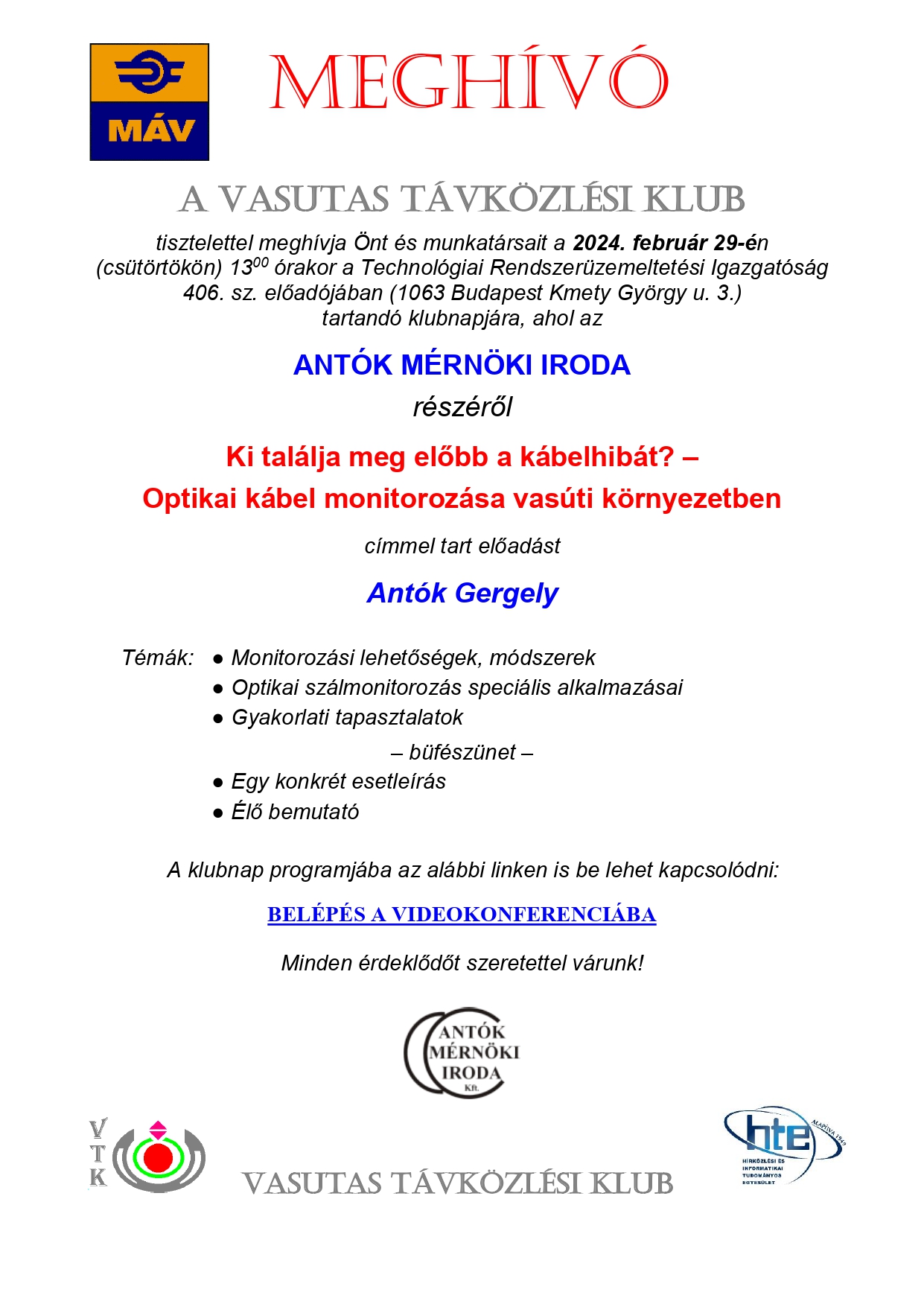 A VASUTAS TÁVKÖZLÉSI KLUB tisztelettel meghívja Önt és munkatársait a 2024. február 29-én (csütörtökön) 13:00 órakor a Technológiai Rendszerüzemeltetési Igazgatóság 406. sz. előadójában (1063 Budapest Kmety György u. 3.) tartandó klubnapjára, ahol az