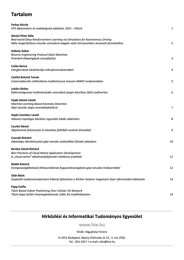 konzulens: Dr. Vári Péter, Egyed Péter Dicséret: Márki Bence: P2P tunnelek automatizált kialakítása és ellenőrzése (BME – HIT) konzulens: Dr. Zsóka Zoltán, Horváth Dániel Dicséret: Knoll Zsolt: Hierarchikus struktúrájú adathalmazok spektrális klaszterezése Generative Adversarial Network használatával (BME-TMIT) konzulens: Papp Dávid, Dr. Szűcs Gábor | - Kóbor Dávid: Antenna nyalábformálásra alkalmazott optikai módszerek vizsgálata (BME – HVT)