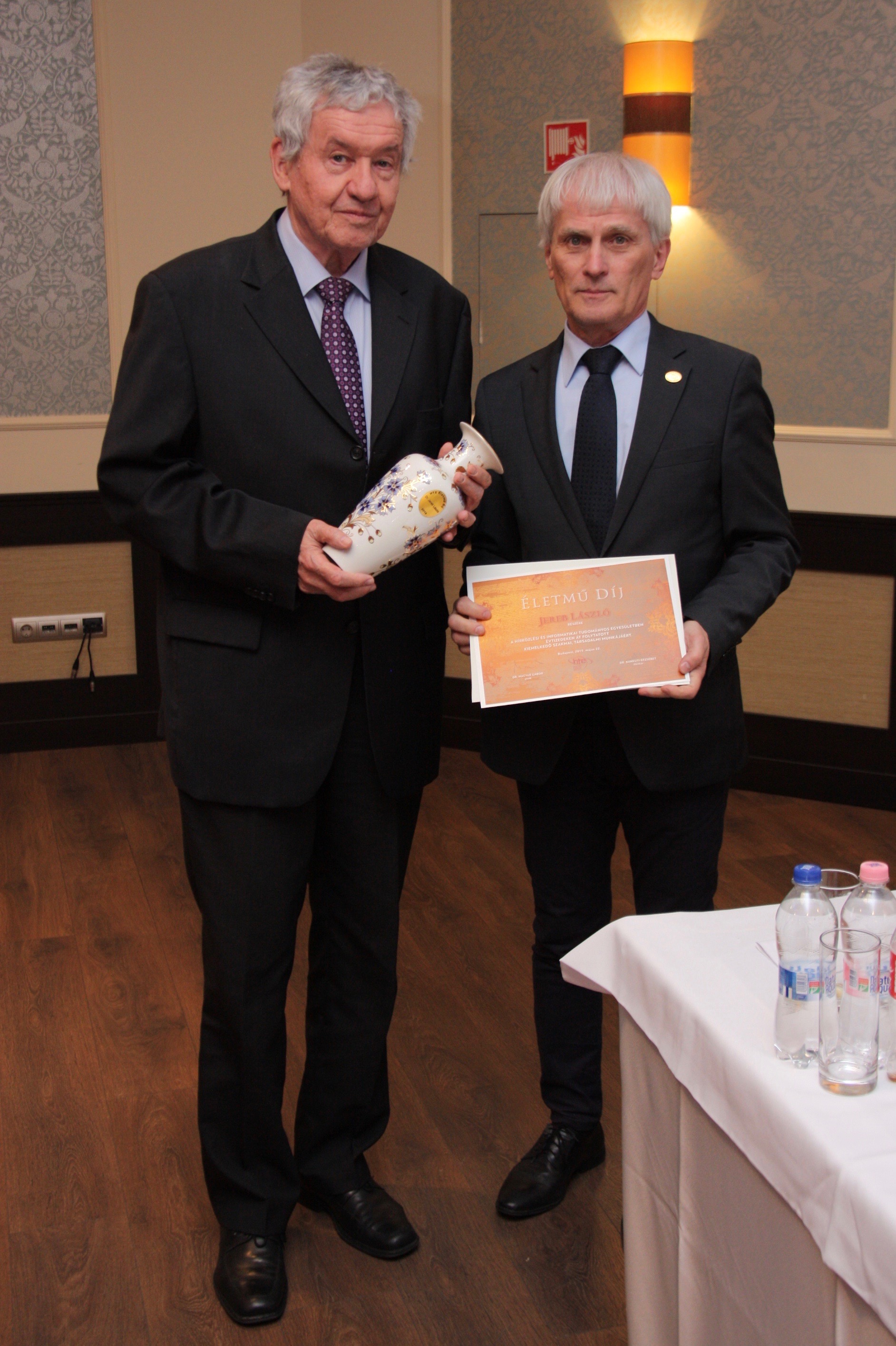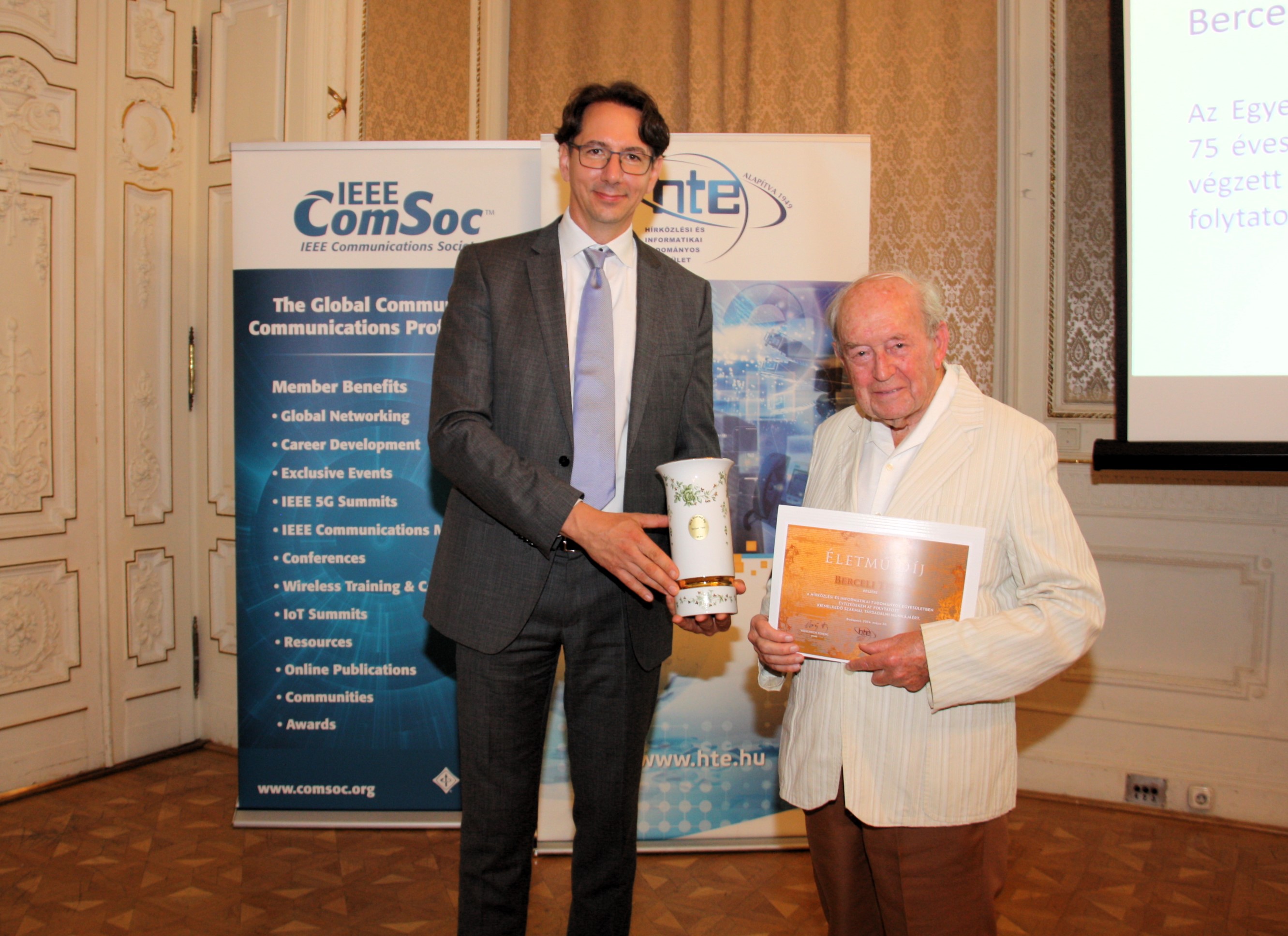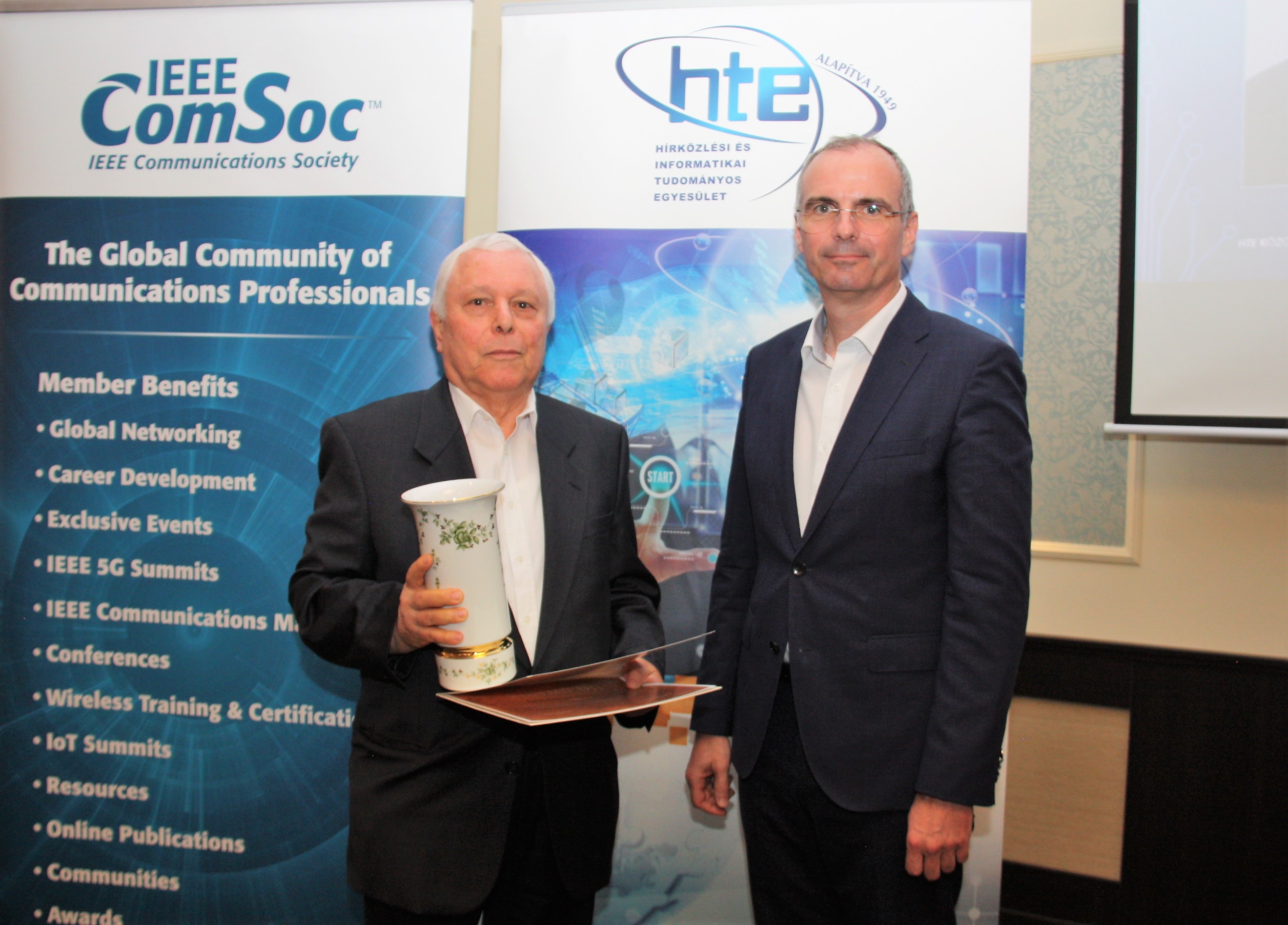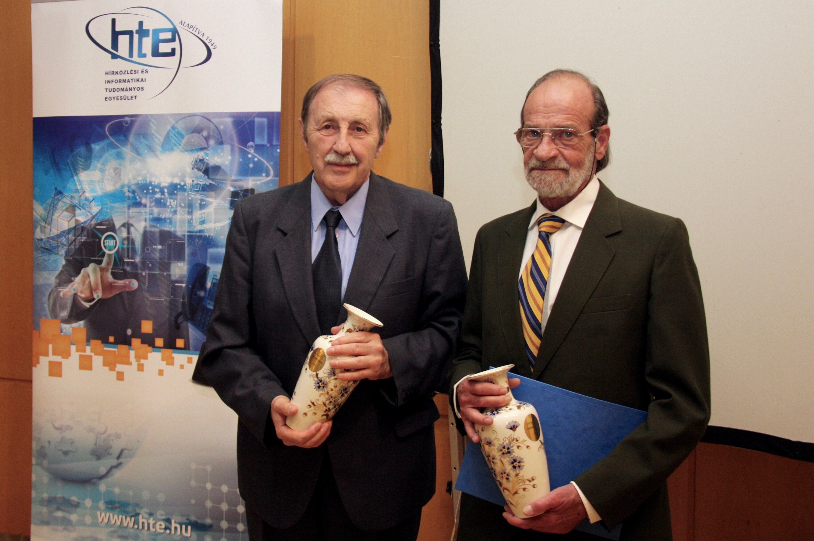 | Turányi Gábor | Az Egyesület a HTE Életmű díjjal Turányi Gábor teljes életútját kívánja elismerni, szakmai sikerein és jelentős társadalmi tevékenységén, egyesületi munkáján kívül külön értékelve azt az őszinte, egyenes hozzáállást a szakmai kérdésekhez, melyek hozzásegítették a hazai hírközlést az elmúlt évtizedekben elért fejlődéshez. | ![]() Varsányi János és Turányi Gábor |