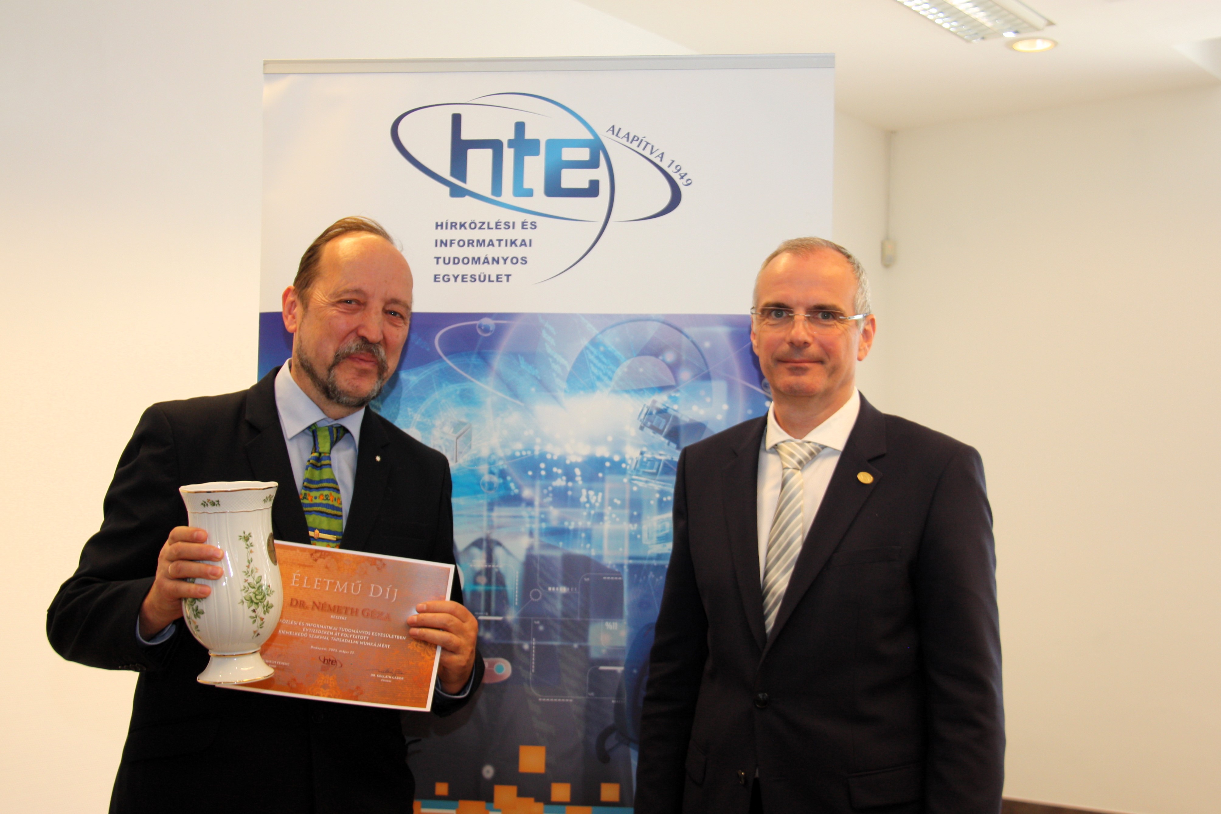 | Németh Géza 2025 | Az Egyesület a HTE Életmű-díj odaítélésével Németh Géza eddigi életútján az oktatásban és a beszédinformációs rendszerek terén elért elméleti és gyakorlati eredményeit, valamint a HTE-ben végzett szakmai munkáját és önzetlen közösségi tevékenységét kívánja elismerni.